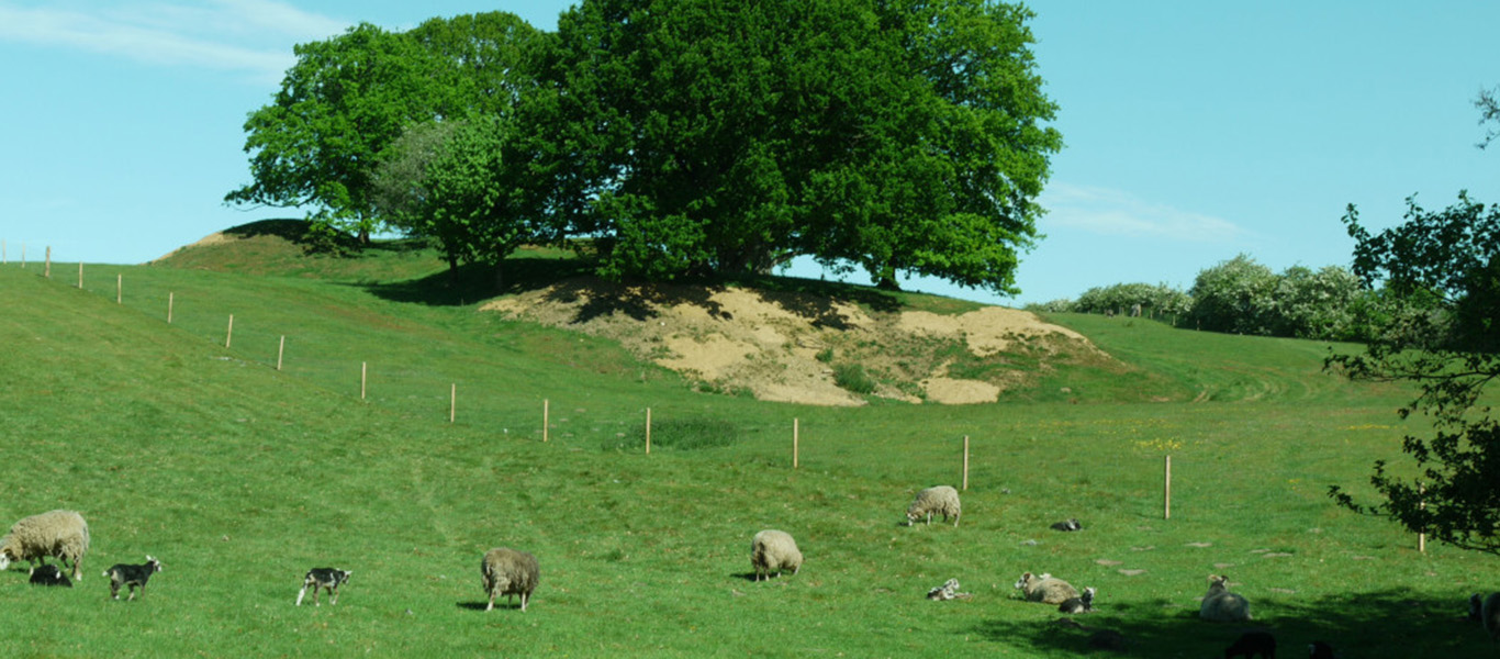 Gå tilbage til vejen og forsæt til højre gennem lågen ind på den indhegnede mark. Følg stien forbi Guldbergs høj til det første voldsted, Brattingsborg, som anses for at være det ældste af de tre anlæg, består af to firsidede banker, der er adskilt af en grav. Den er ca. 6 meter høj. |