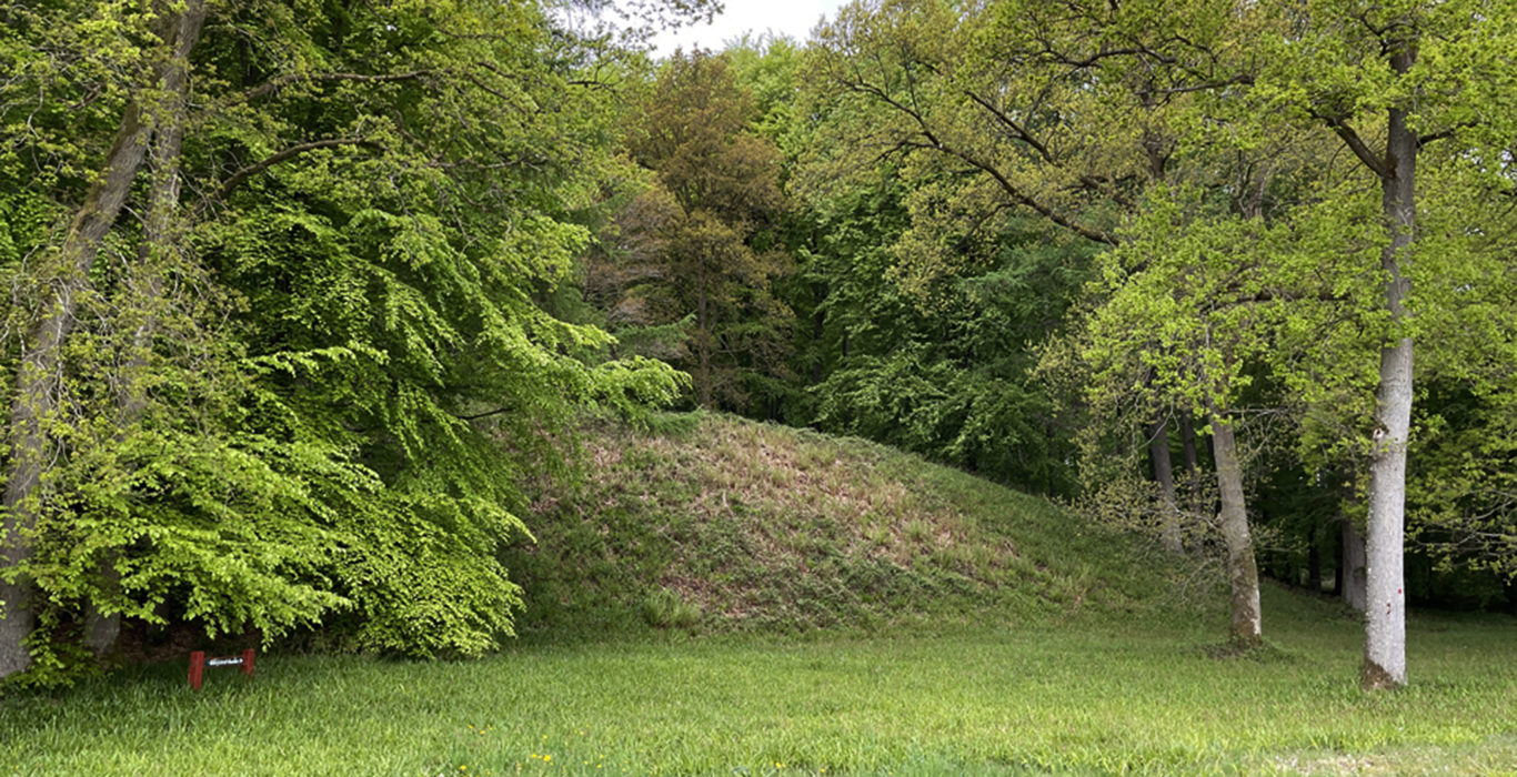 Mens Stenborg og Hønborg stadig er gemt bag en strandeng, ligger den gamle borgbanke ved Hindsgavl helt ud mod stranden. Selve banken hæver sig 15 meter over strandkanten og har en diameter på 75 meter. Oprindeligt lå den dog midt i ”Sudden”, et sumpområde. Herover førte en bro, der forbandt ladegården med den store borgbanke.